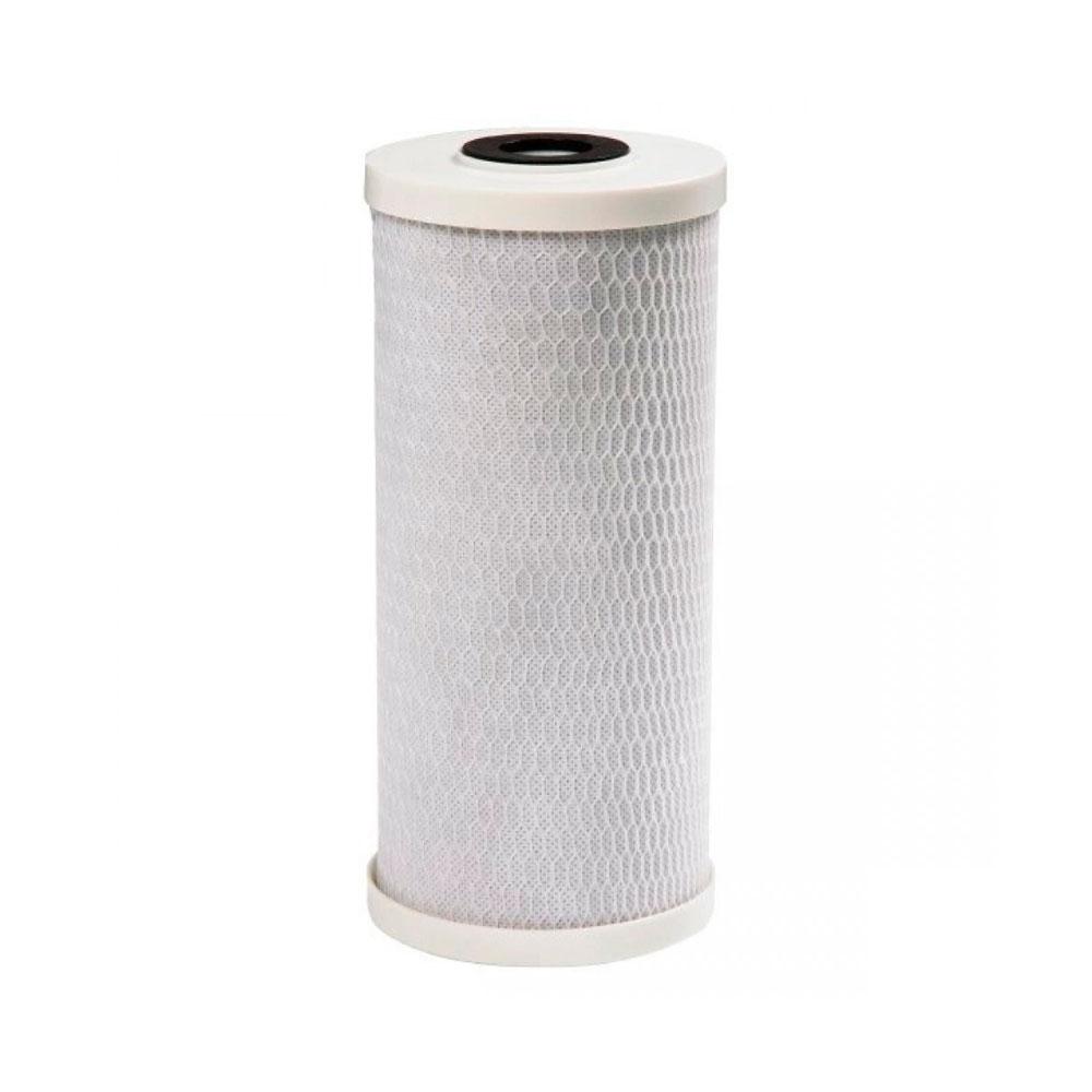 Сорбционный картридж из прессованного активированного угля. Очищает воду от широкого спектра органических и неорганических растворенных примесей (свободного хлора, хлорорганических соединений, пестицидов, нефтепродуктов, тяжелых металлов, иных органических и неорганических соединений), устраняет неприятный запах воды, улучшает ее вкус. Используемая специальная технология спекания активированного угля предотвращает выброс в отфильтрованную воду адсорбированных ранее загрязнителей.