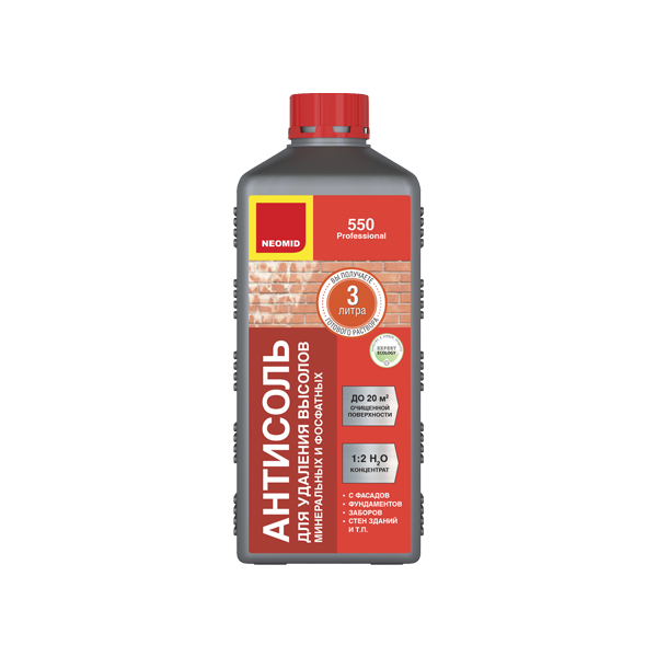 NEOMID 550 предназначен для удаления минеральных высолов различного происхождения и состава с кирпича, природного и искусственного камня, бетона и т.п.