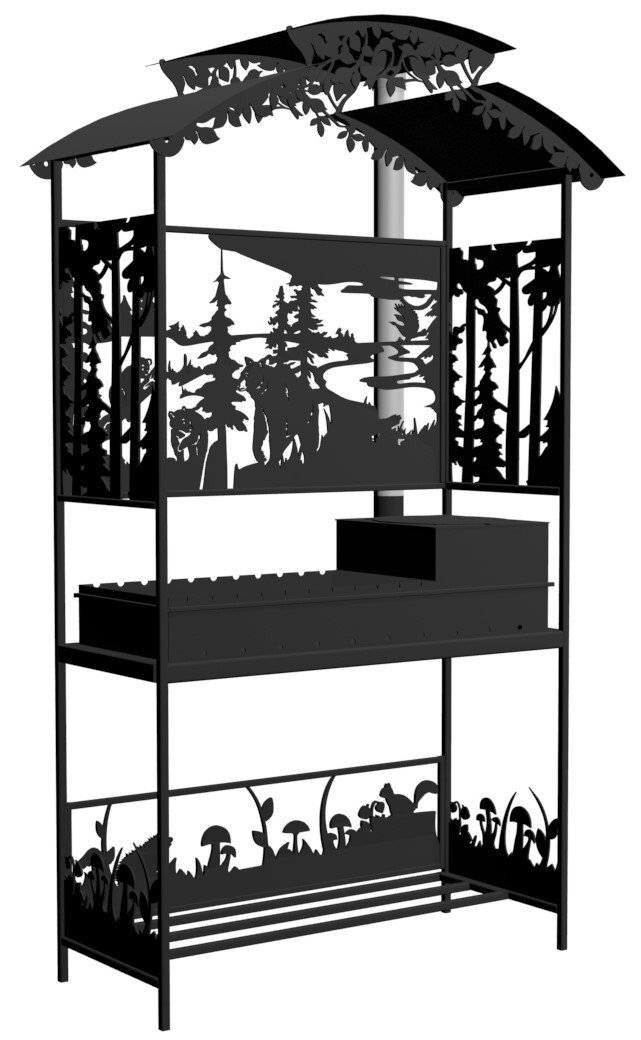 Мангал Три Медведя Лайт Казан - это металлический разборный мангал среднего размера с крышей и с резными рисунками медведей в лесу. Новинка 2019 года!