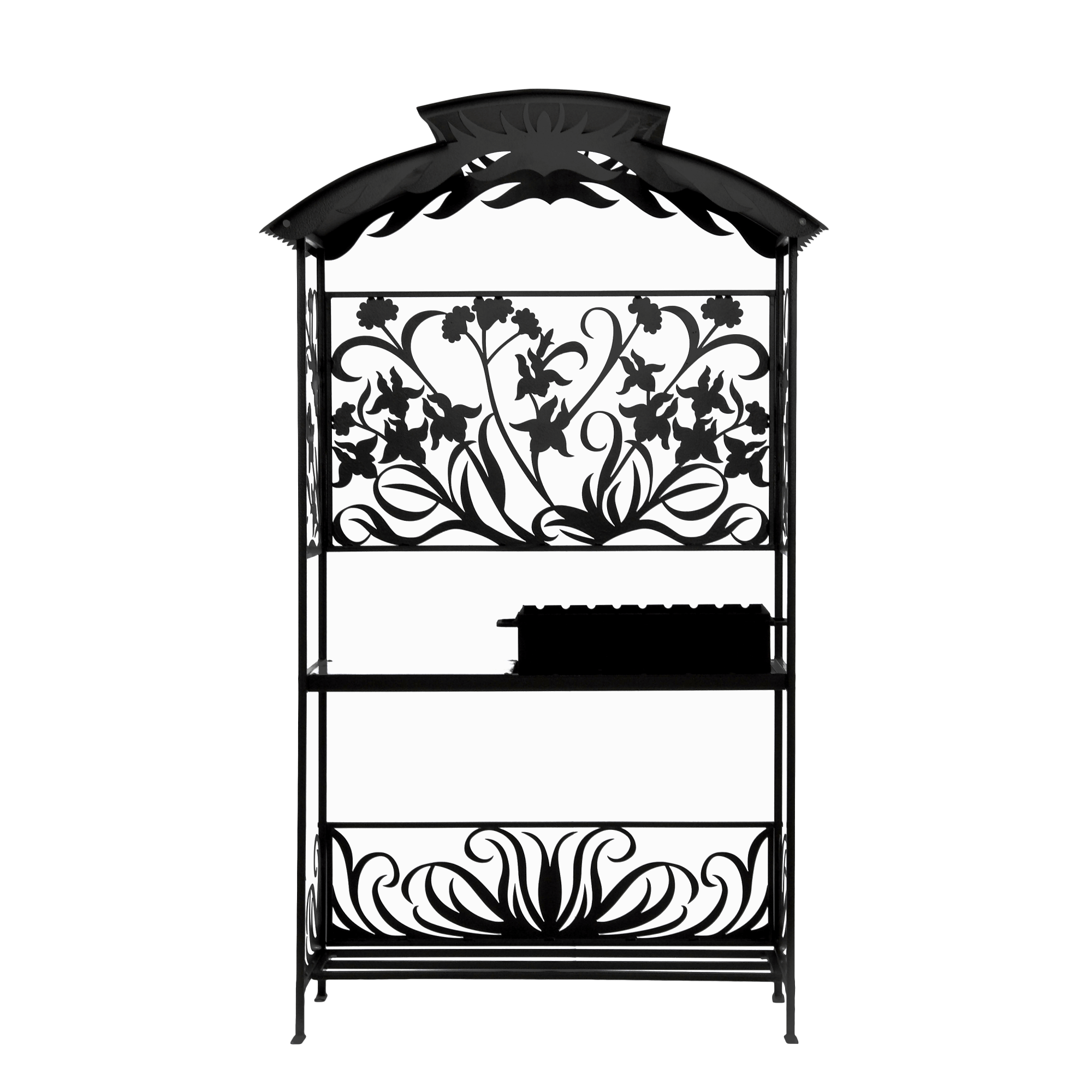 Мангал Ирисы Лайт М60 - это металлический разборный мангал среднего размера с крышей и резными рисунками в виде ирисов.