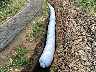 Дренажный блок полностью обернут геотканью, что предотвращает попадание мелкого мусора в систему.