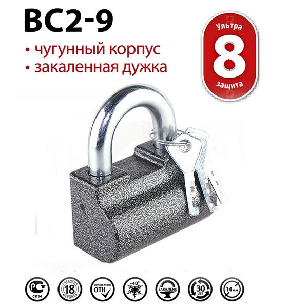 Морозоустойчивый и износоустойчивый замок навесной ВС2-9 спроектирован на долголетний срок эксплуатации до 30 лет. Работоспособен при низких температурах России.