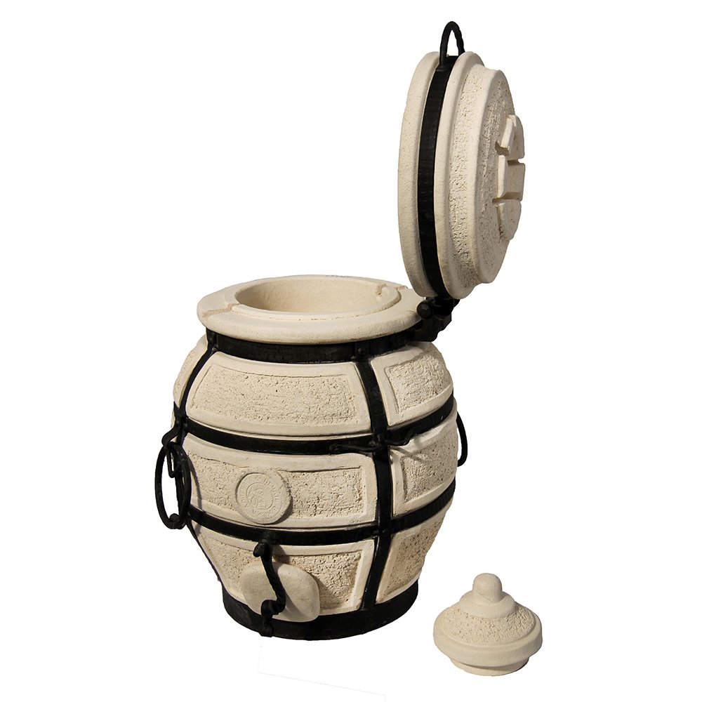 Тандыр сделан из шамотной глины и имеет толстые 5-сантиметровые стенки. За счет этого даже от маленькой вязанки дров жара хватит для приготовления большого количества еды. Другие достоинства модели: красивый дизайн.