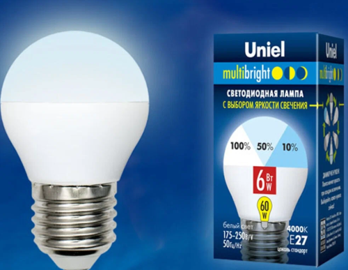 Лампа светодиодная LED Uniel Е27 6Вт шар 3000K тёплый свет с выбором яркости 10-50-100%