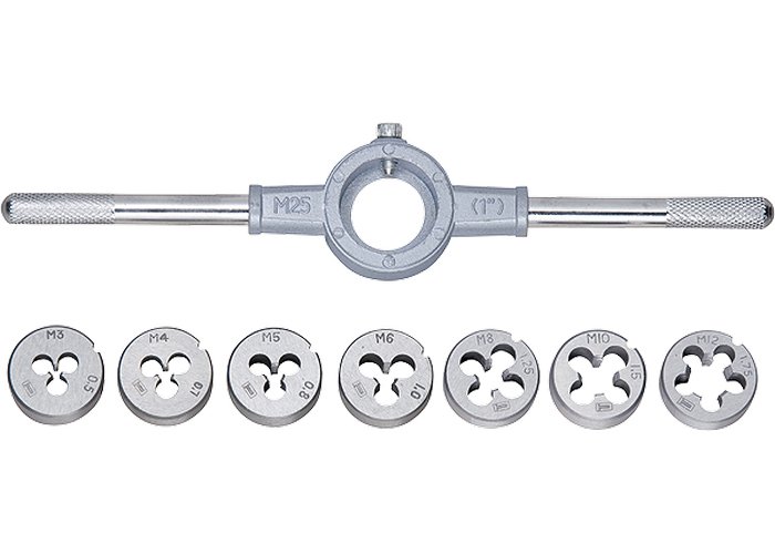 Набор плашек предназначен для нарезания внешней резьбы разного диаметра. Подходит для работы с цветными металлами и сталями, предел прочности которых составляет 800 Н/мм2. Плашки изготовлены из высококачественной легированной инструментальной стали 9ХС твердостью 62-64 HRC. На каждом изделии маркировка с указанием размера и шага резьбы.