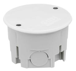 Коробка распределительная (соединительная) круглая предназначена для установки розеток, выключателей, других электроустановочных изделий, для соединения и (или) протяжки проводов в кирпичных и бетонных стенах. Коробки могут соединяться между собой с помощью кабель-канала (поставляется отдельно), который обеспечивет межосевое расстояние 71 мм. и образует при этом закрытый соединительный канал для проводки. Коробка соединительная имеет съемную крышку, соединяющуюся с корпусом коробки двумя шурупами (саморезами) размером 3х20 мм. Цвет корпуса серый, крышка белая. Материал пластик.