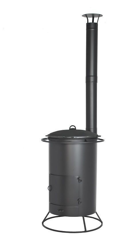 Печь под казан с трубой малая предназначена для приготовления пищи под открытым небом, благодаря тому, что печь под казан имеет высокую вытяжную трубу самоварного типа. Дым, выходящий из трубы, не мешает окружающим. Колосниковая решётка, выполненная из чугуна, выдвижным зольным ящиком позволяет удалить золу при работающей печи. Так же выдвижной зольный ящик дает возможность регулировать интенсивность горения дров в топке.