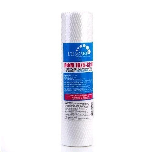Картридж ПФМГ 10/5 - 10SL изготовлен из вспененного полипропилена. Имеет градиентную пористость: диаметр поры уменьшается при движении воды внутрь картриджа, благодаря чему работает весь объем фильтрующего материала. Картридж ПФМГ 10/5 - 10SL применяется в магистральных фильтрах Гейзер 1Г мех 1/2" и Гейзер 1Г мех 3/4" для очистки воды от нерастворимых примесей (более 5 мкм).