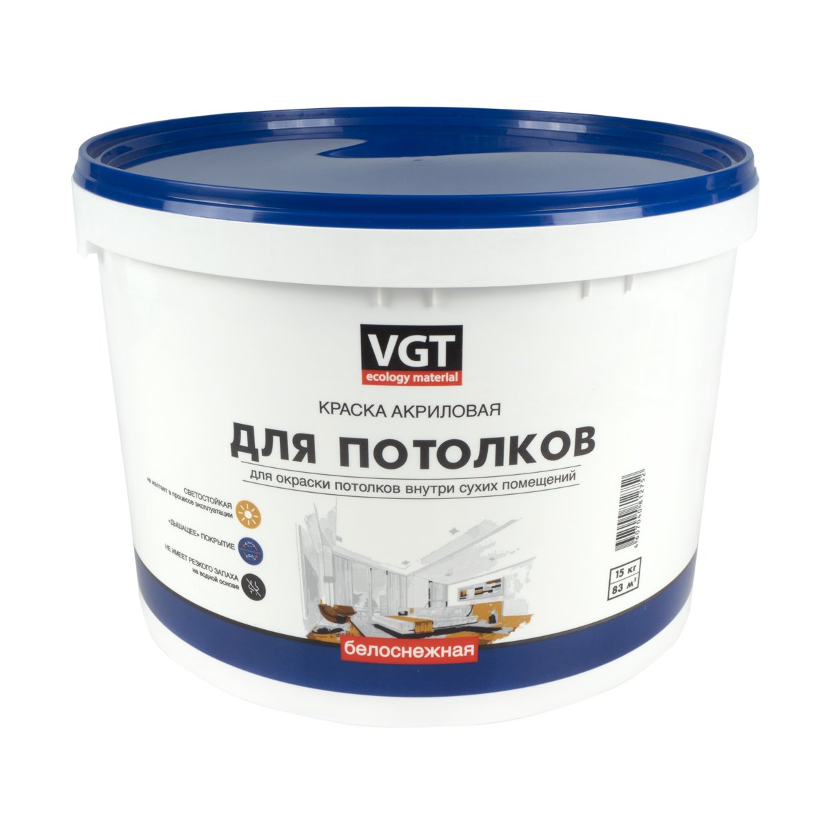 Краска интерьерная для стен и потолков VGT ВД-АК-2180, акриловая, белоснежная, 15 кг. Предназначена для окраски стен и потолков в помещениях с нормальной влажностью, а также для окрашивания различных типов обоев. Применяется во всех типах зданий и сооружений (А-В). Краска интерьерная белоснежная для стен имеет хорошую адгезию к бетонным, кирпичным, гипсокартонным и оштукатуренным поверхностям. Устойчива к незначительным механическим воздействиям. После высыхания образует ровную матовую поверхность. Светостойкая (не желтеет в процессе эксплуатации). Допускается легкая влажная уборка. Образует «дышащее» покрытие. Колеровка: может колероваться колеровочными красками фирмы VGT. Подготовка поверхности: рабочая поверхность должна быть сухой и чистой. Отслаивающиеся старые покрытия должны быть удалены. Рекомендуется предварительное грунтование поверхности. Состав: водная дисперсия акрилового полимера, мраморная крошка, двуокись титана, модифицирующие добавки. Белизна: не менее 90%. Расход: расход краски на однослойное покрытие - 180 г/м² по гладкой поверхности, по шероховатым и сильновпитывающим поверхностям - 250 г/м², рекомендуется нанесение двух и более слоев краски с промежуточной сушкой 1 час. Метод нанесения: наносится кистью, валиком или краскопультом. Возможно нанесение на старую масляную или пентафталевую краску с предварительным грунтованием поверхности грунтовкой по старой краске нашей фирмы. Рекомендуется двукратное нанесение краски с промежуточной сушкой 1 час. Разбавитель: вода, не более 5%. Время высыхания: до отлипа – 1 час, полное высыхание через 24 часа при нормальных условиях. Сухой остаток: не менее 55%. Плотность: 1,5 г/см³. Хранение: в плотно закрытой таре при температуре от 0°С до +40°С. Выдерживает замораживание до -25°С, но не более пяти циклов замораживания-оттаивания. Не рекомендуется: окраска поверхности при повышенной влажности и температуре ниже +7°С.