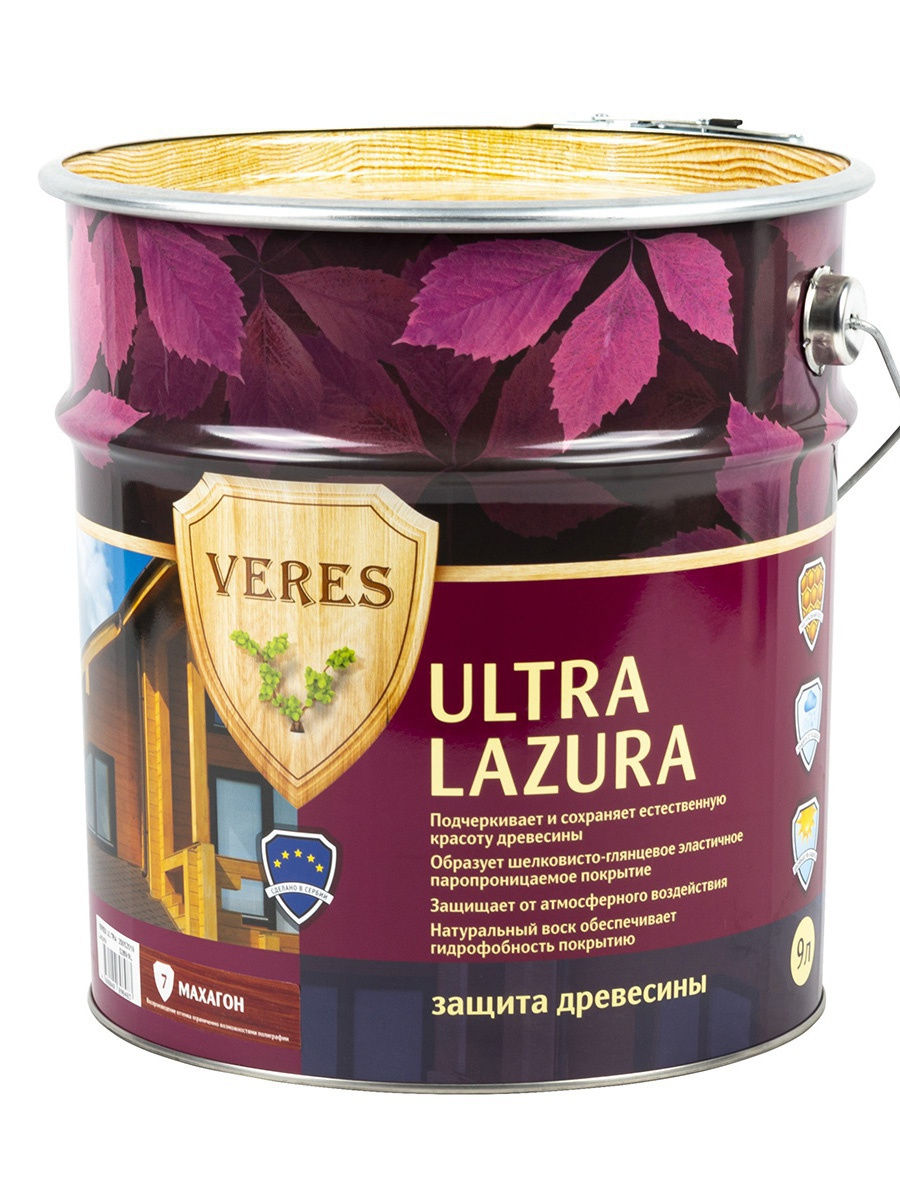 Высокоэффективная тиксотропная шелковисто-глянцевая декоративно-защитная лессирующая пропитка для древесины УЛЬТРА ЛАЗУРА "VERES". Надежная защита от УФ — излучения и атмосферных влияний Тиксотропная — не капает с кисти и не образует подтеков Удобна в нанесении Натуральные масла и воски в составе обеспечивают гидрофобность и пониженное грязеудержание Срок эксплуатации покрытия до 10 лет (в системе отделки с грунтовочным составом Veres Base)