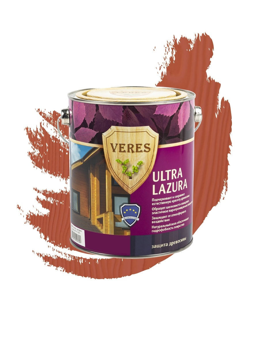 Декоративная пропитка для дерева Veres Ultra Lazura №29, глянцевая, 2,7 л, калужница. Высокоэффективная тиксотропная шелковисто-глянцевая декоративно-защитная лессирующая пропитка для древесины УЛЬТРА ЛАЗУРА ""VERES"". Надежная защита от УФ — излучения и атмосферных влияний Тиксотропная — не капает с кисти и не образует подтеков Удобна в нанесении Натуральные масла и воски в составе обеспечивают гидрофобность и пониженное грязеудержание Срок эксплуатации покрытия до 10 лет (в системе отделки с грунтовочным составом Veres Base)Предназначена для обработки новых и очищенных от старого покрытия деревянных поверхностей: стеновых панелей, обшивочных досок, заборов, дверей, оконных рам и других изделий и конструкций, а также ДСП, фанеры и шпона. Эластичное паропроницаемое тонкослойное покрытие подчеркивает и сохраняет естественную красоту древесины, глубоко проникая и защищая от плесени и грибка. Специально подобранная система УФ-фильтров, транспарентных пигментов, натуральных масел и восков обеспечивает формирование высокопрочного и атмосферостойкого покрытия. При использовании состава Veres Ultra Lazura внутри помещения, необходимо соблюдать меры предосторожности и обеспечить хорошую вентиляцию помещения во время проведения покрасочных работ. После полного формирования алкидной пленки покрытие абсолютно безопасно.Состав: алкидная смола, транспарентные пигменты стойкие к воздействию солнечных лучей и атмосферных влияний, УФ-фильтры, натуральные масла, микровоск, функциональные добавки, сиккативы (не содержащие свинец), уайт-спирит. Maксимальная влажность древесины при нанесении состава должна быть менее 20%.. Поставляется в 12 стандартных цветах, имитирующих натуральные оттенки древесины. Внимание! Бесцветный состав можно применять только для внутренних работ. Блеск шелковисто-глянцевый. Метод нанесения кисть, валик, метод распыления или окунания. Срок годности: 5 лет с даты изготовления при температуре не выше +30С в оригинальной заводской упаковке. Расход до 10 м2 литр (Пиленая древесина на один слой), до 12 м2 литр (Строганая древесина на один слой). Время высыхания 6 часов - до нанесения следующего слоя, 24 часа - до полного высыхания.