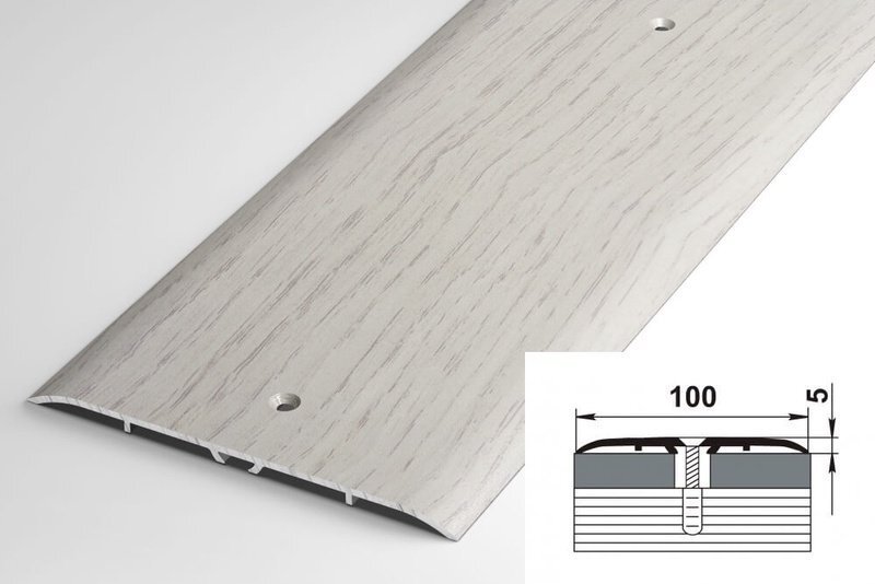 Данная модель предназначена для скрытия стыков двух одноуровневых напольных покрытий, изготовленных из различных материалов. Пороги с отверстиями для монтажа поставляются в индивидуальной упаковке с саморезами и дюбелями.