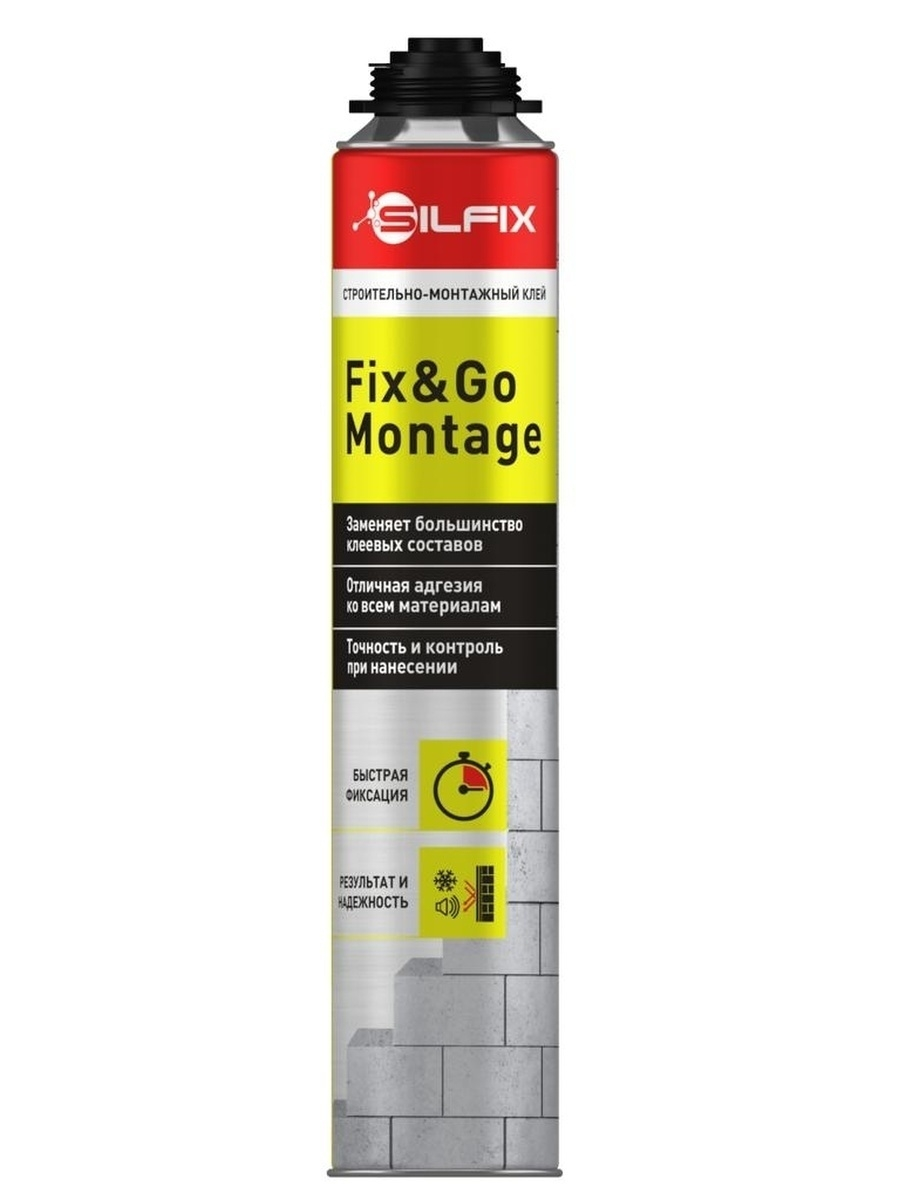 Строительно-монтажная клей-пена Sila Fix&GO Montage, 750 мл SGLUPU750 - это однокомпонентный, готовый к применению, полиуретановый клей в аэрозольной упаковке. Не содержит озоноразрушающих веществ. Затвердевает под действием влаги. Клей-пена наносится с помощью пистолета для монтажной пены. Применяется внутри и снаружи помещений.**Область применения:**- Приклеивание теплоизоляционных плит из пенополистирола и экструзионного- пенополистирола (XPS).- Приклеивание гипсокартонных и фиброцементных плит- Приклеивание декоративных панелей из дерева, пластмассы и т.п.- Приклеивание облицовочных керамических плит, утеплителя, плинтусов, сборки малых- садовых архитектурных форм и т.п.- Для заполнения небольших полостей, щелей и соединений между плитами.