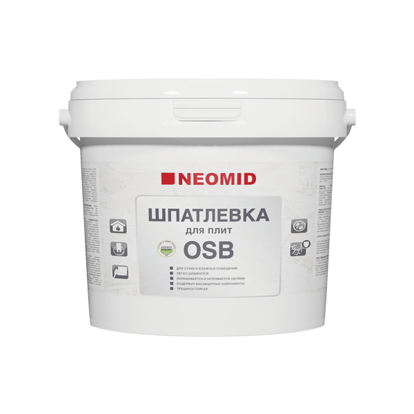 Полимерная шпатлевка для плит OSB 1,3 кг Neomid Н-ШпатлOSB-1,3 на водной основе полностью готова к применению. Подходит для работы в сухих и влажных помещениях. После применения состава поверхность может подвергаться шлифовке, окрашиванию и оклейке обоями.