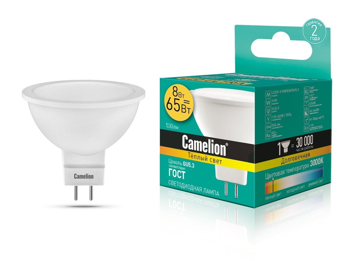 Лампа светодиодная LED Camelion GU5.3 8Вт JCDR 3000K тёплый свет // эквивалент 65Вт 12871