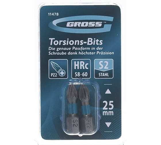 Набор торсионных бит PZ2 x 25 мм Gross 11478, 2 шт., предназначен для монтажа и демонтажа резьбовых соединений с помощью ударного шуруповерта. Он незаменим в строительных, слесарных и монтажных работах, в автосервисах, при проведении ремонта в доме. Торсионная зона способна пружинить, за счет чего она частично амортизирует тангенциальный удар от шуруповерта. Такое решение позволяет равномерно распределить нагрузку по бите и избежать поломки шлица.
