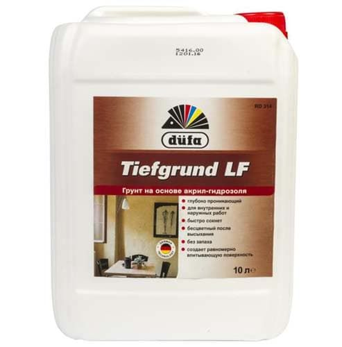 Грунтовка Dufa Tiefgrund D314 LF (10 л разведение 1:4) – бесцветная после высыхания универсальная грунтовочная смесь на основе акрил-гидрозоля. Водоразбавляемая. Имеет молочно-белый индикатор. Характеризуется высокой адгезией и хорошей проникающей способностью. Наносится легко, сохнет быстро. Не оставляет пятен на поверхности. Стабилизирует структуру материала и выравнивает его впитывающую способность, укрепляет его и отлично подготавливает к нанесению декоративных составов и приклеиванию обоев. Образует паропроницаемый слой, устойчивый к щелочам. Может использоваться внутри и снаружи помещений. Особенно рекомендуется для гипсокартона и меловых оснований.