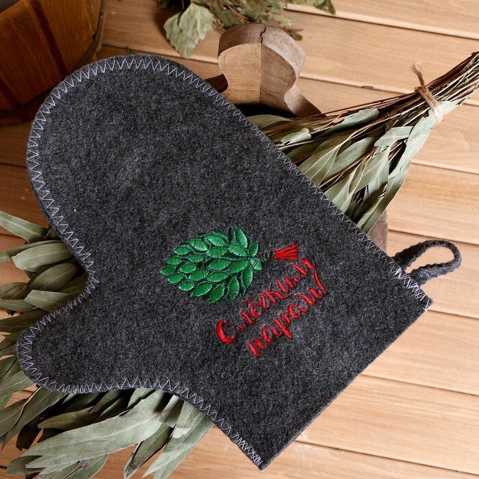 Рукавичка для бани серая с вышивкой сад