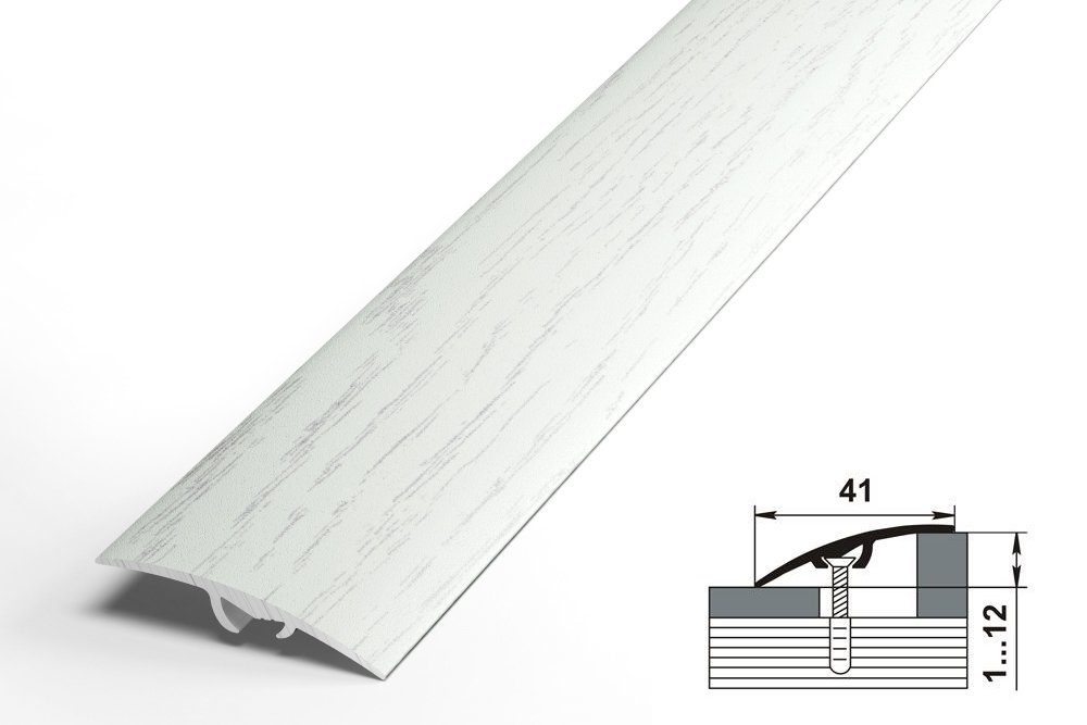 Порог скрытого монтажа, гладкая поверхность, широкая цветовая гамма, не подвергается коррозии. Каждый профиль поставляется в индивидуальной упаковке, оснащенной пластиковым европодвесом, в комплекте с саморезами и дюбелями.