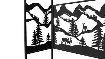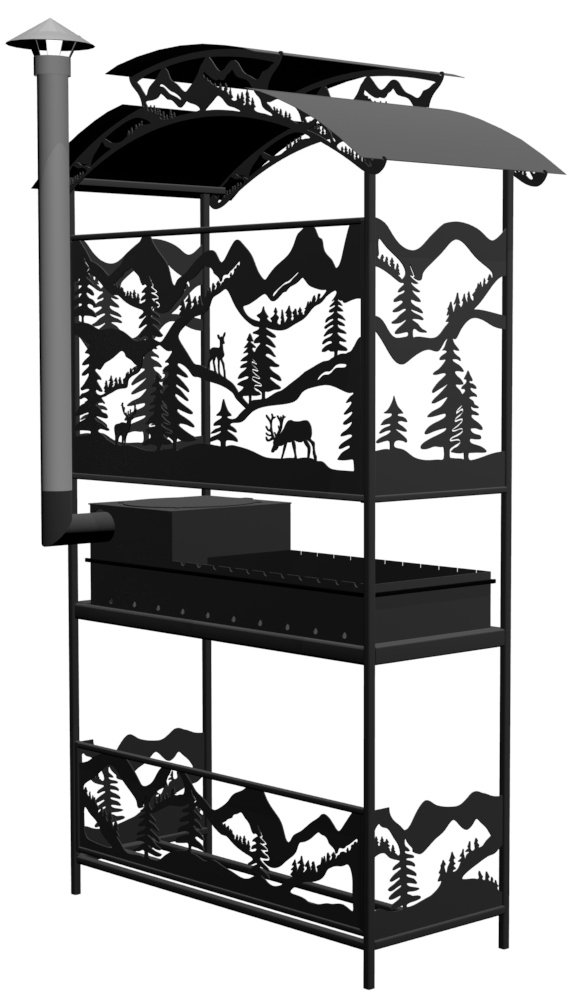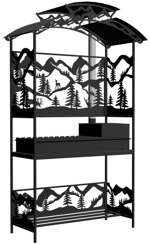 Мангал Олени Лайт Казан - металлический разборный мангал среднего размера с крышей и резными рисунками в виде оленей в лесу.