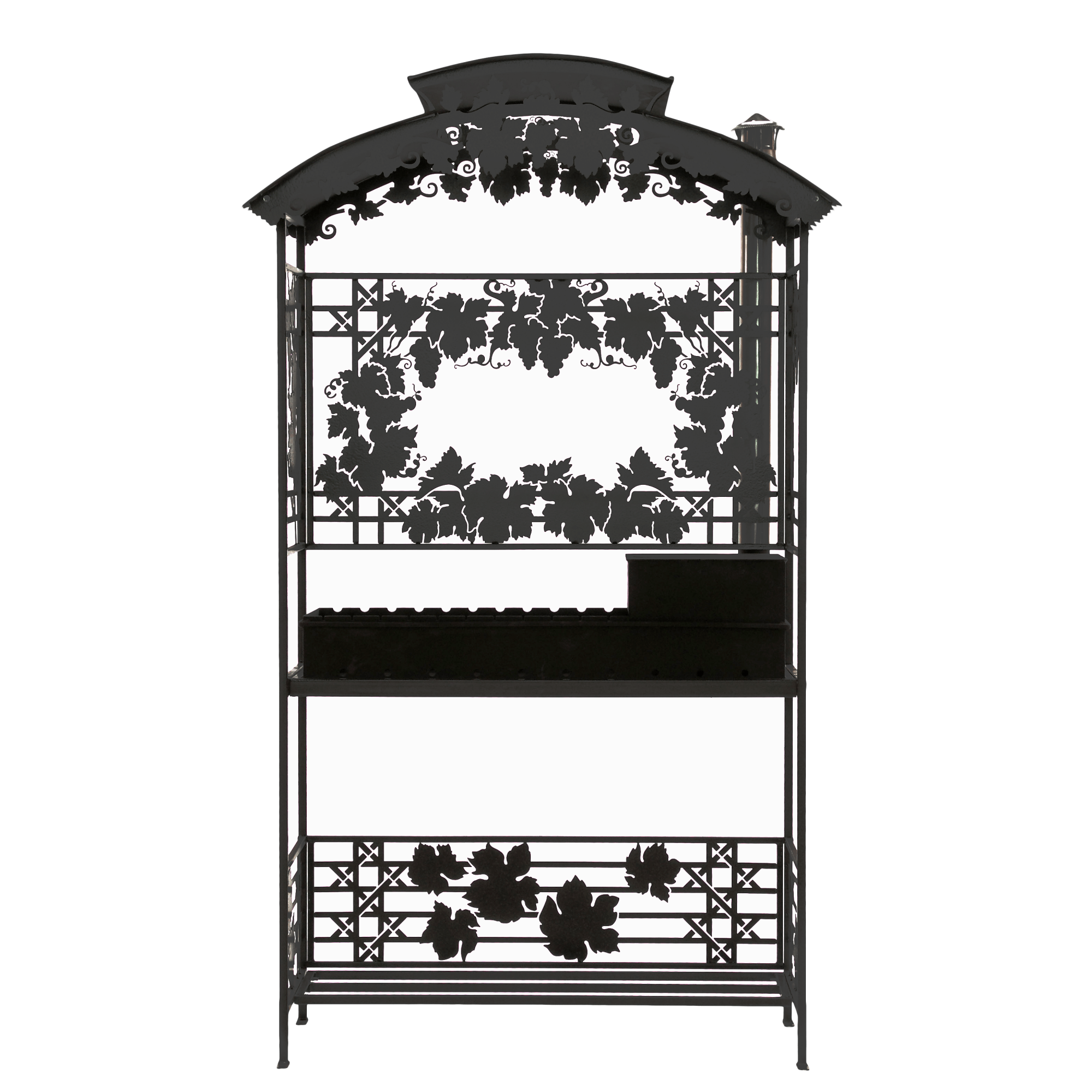 Мангал Виноград Лайт М108К (с печью под казан) - это металлический разборный мангал среднего размера с крышей и резными рисунками в виде гроздей винограда.