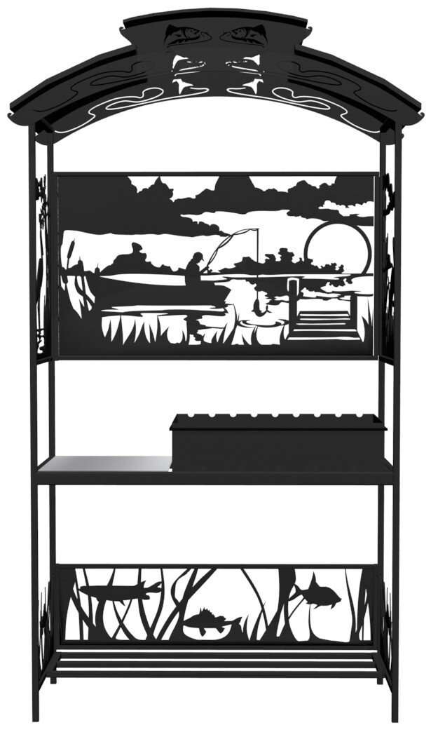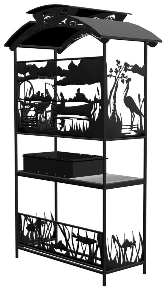Мангал Рыбалка Лайт - это металлический разборный мангал среднего размера с крышей и резными рисунками с мотивом рыбалки на тихой реке. Новинка 2019 года!