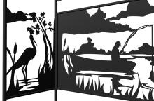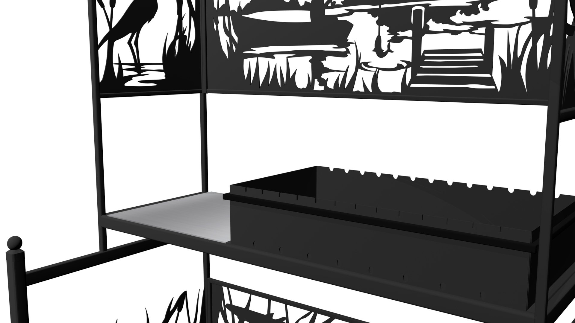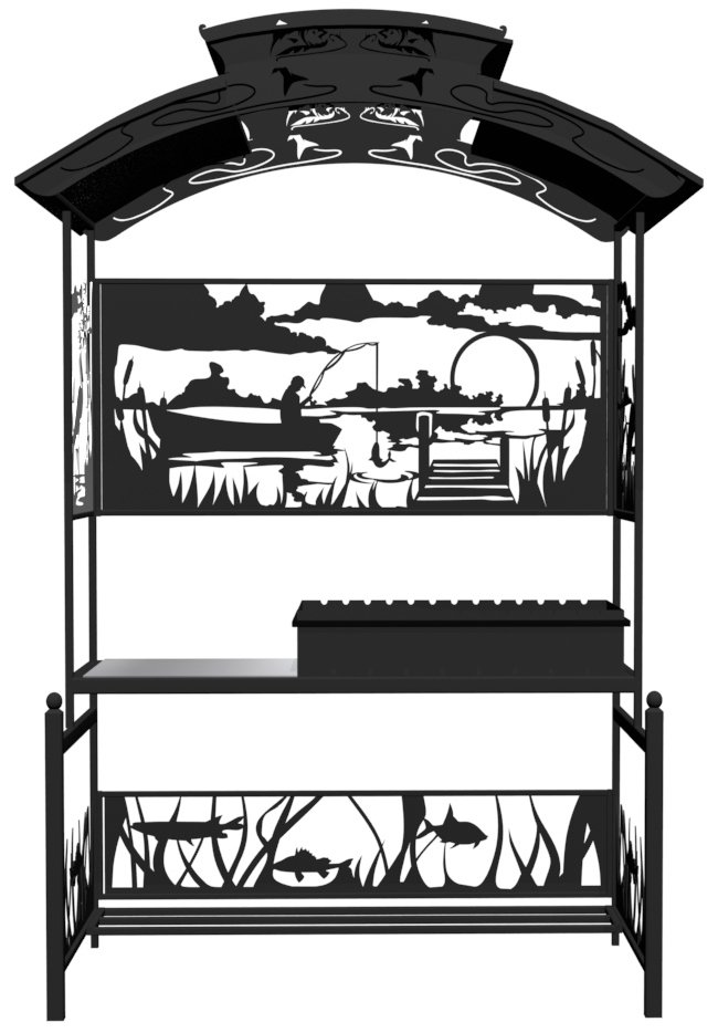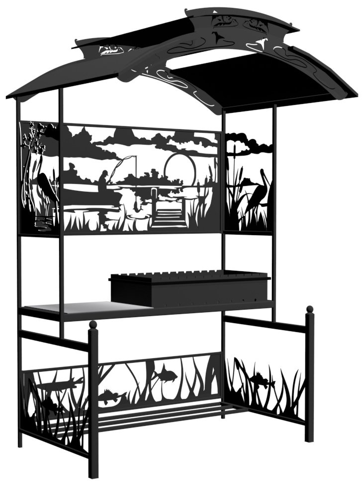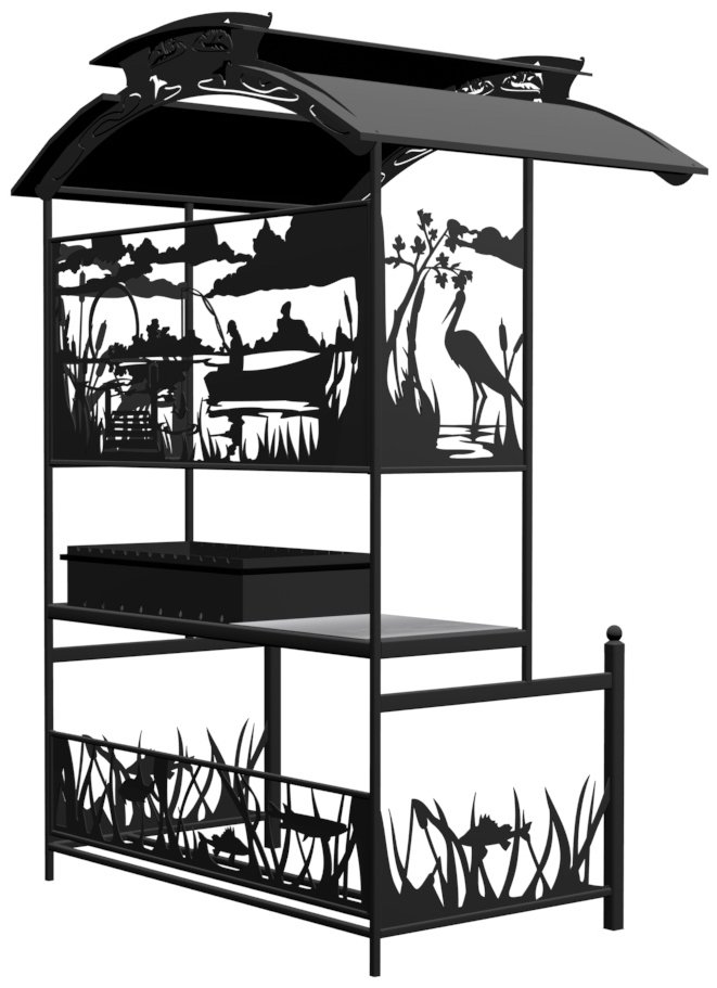 Мангал Рыбалка - это металлический разборный мангал с крышей, с резными рисунками с мотивом рыбалки на тихой реке. Новинка 2019 года!