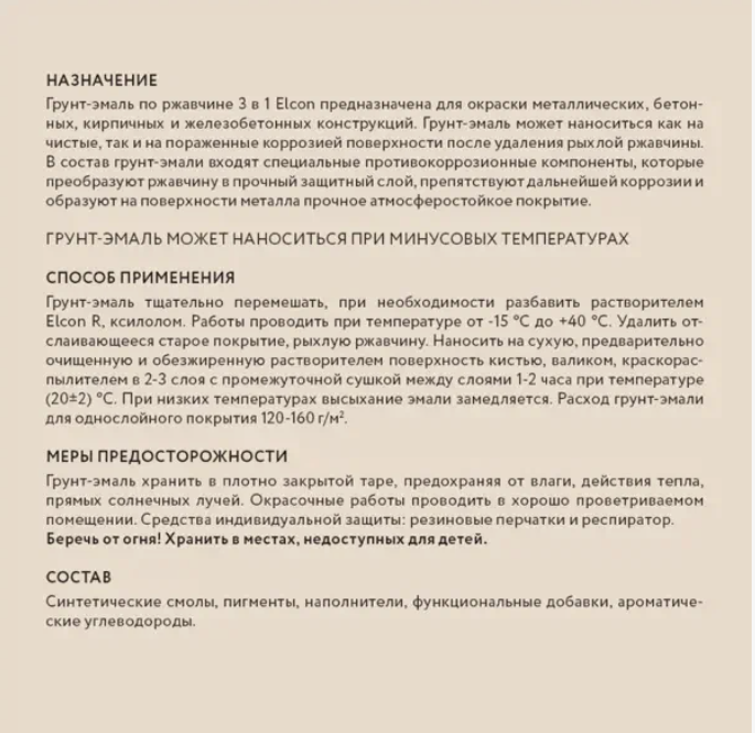 Грунт-эмаль по ржавчине Elcon 3 в 1 (0,4л) предназначена для нанесения на чистые и на пораженные коррозией металлические поверхности для создания надежной антикоррозионной защиты металлоконструкций, оборудования, металлических изделий.