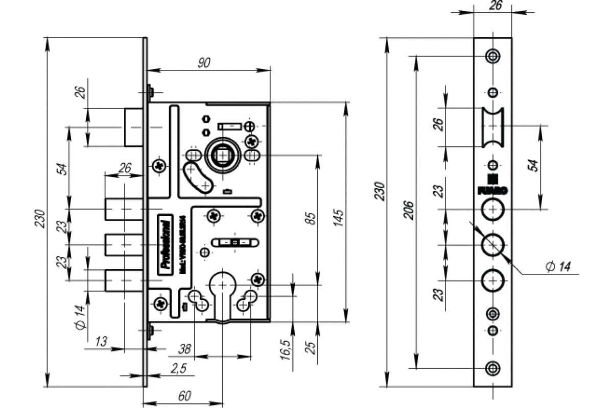 Технические характеристики корпуса врезного замка Fuaro c защелкой