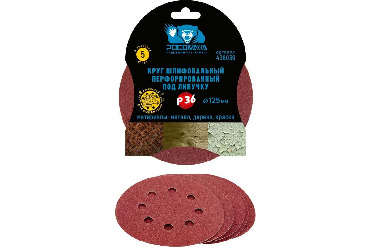 Круг шлифовальный перфорированный, 8 отверстий, 125 мм, P36, 5 шт Росомаха 438036 высокопроизводительный шлифовальный круг с полуоткрытой насыпкой обеспечивает равномерный рисунок шлифования всех видов материалов. Благодаря подборке качественных составляющих достигается высокая производительность.