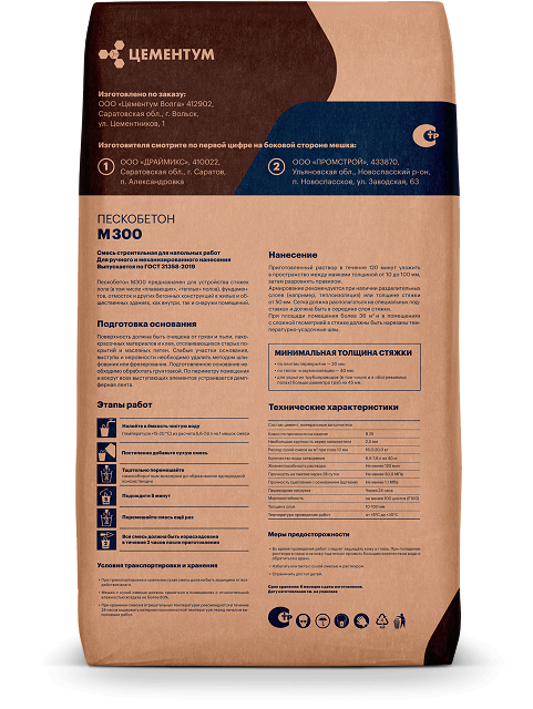 Пескобетон M300 — это сухая смесь на основе цемента собственного производства и тщательно подобранного мелкого заполнителя, выпускаемая в соответствии с требованиями российского стандарта ГОСТ 31358-2019.