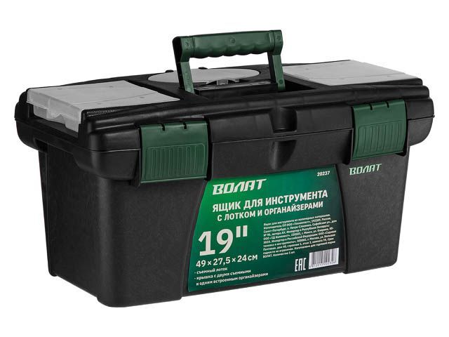 Ящик предназначен для хранения и удобной транспортировки инструментов. Подвижный лоток и два съемных органайзера на крышке позволяют разместить необходимые инструменты и аксессуары. Ящик надежно закрывается с помощью защелок.
