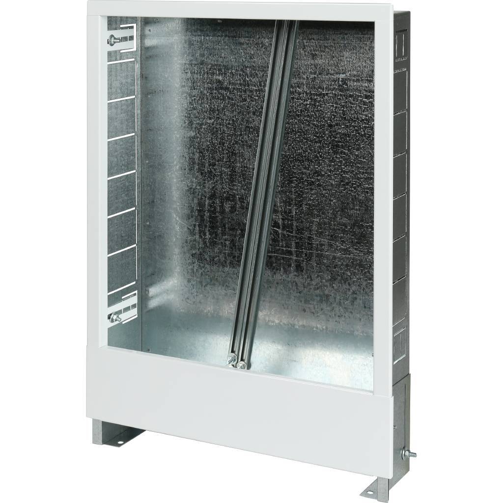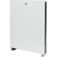 Шкаф предназначен для размещения в нем распределительных коллекторов и коллекторных блоков для систем отопления с поквартирной разводкой или водопровода. Установка шкафа предполагается в специальный проем в стене. Крепление шкафа осуществляется за счет отверстий в выдвижных ножках (к полу). В стенной нише шкаф фиксируется с помощью отгибных фиксаторов. Требуемая высота шкафа регулируется за счет выдвижных ножек. Ножки шкафа регулируются по высоте – до 90 мм. Выдвижная лицевая рамка позволяет изменять глубину установки со 125 мм до 195 мм. Сегментная перфорация в боковых стенках корпуса шкафа позволяет подсоединить трубопровод в любом месте. Для обеспечения подключения трубной разводки в шкафу отсутствует дно. Внутри шкафа расположены универсальные подвижные крепежные рейки, позволяющие располагать оборудование по всей высоте и ширине шкафа. Корпус распределительного шкафа STOUT изготовлен из оцинкованной стали, имеет антикоррозийное покрытие и окрашен порошковой краской RAL9016. Дверца шкафа из листовой стали, оснащена замком, исключающим несанкционированный доступ к устройствам и смесительным узлам, размещенным в шкафу.