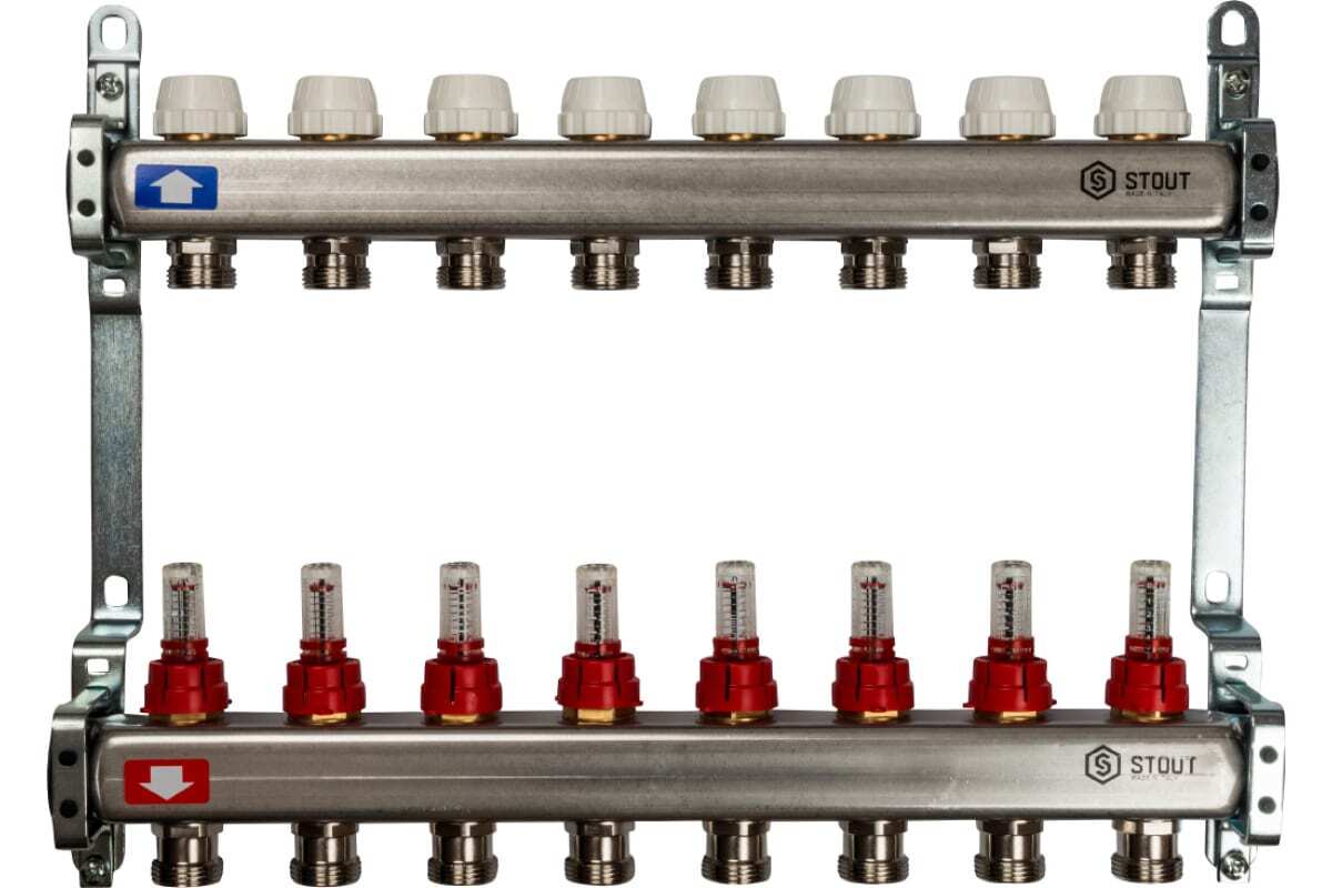 Коллектор из нержавеющей стали с расходомерами 8 вых. STOUT SMS 0917 000008 - отличное решение при организации отопления в квартире или доме, а также при укладке теплого пола. Коллекторный блок распределяет равномерно теплоноситель по всем отопительным компонентам, а также позволяет регулировать поток на каждом контуре.