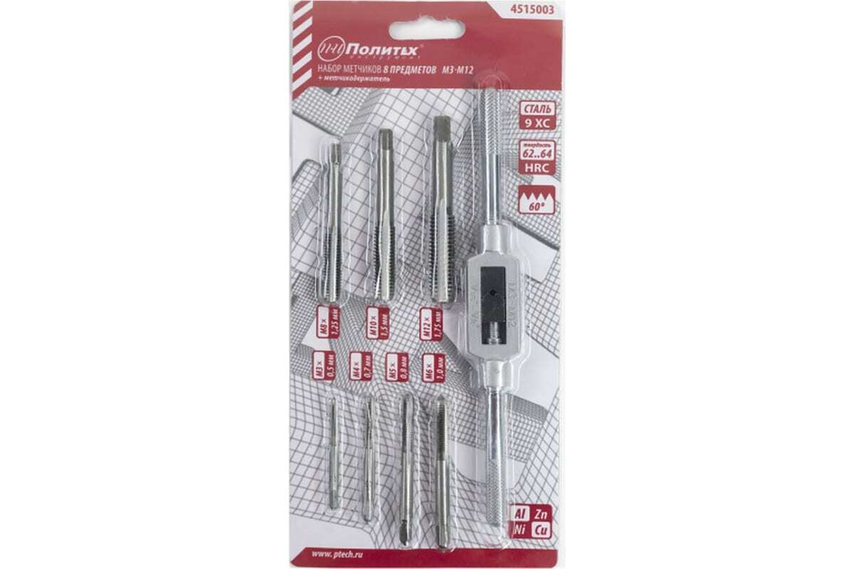 Предназначен для нарезания внутренней резьбы разного диаметра. Подходит для работы с цветными металлами и сталями, предел прочности которых составляет 800 Н/мм2.Метчики изготовлены из высококачественной легированной инструментальной стали 9ХС твердостью 59-62 HRC.На каждом изделии маркировка с указанием размера и шага резьбы. Состав: Метчики - предназначены для нарезания внутренней метрической резьбы с мелким и стандартным шагом в глухих или сквозных отверстиях. Метчикодержатель с регулируемым винтовым механизмом применяется для надежной фиксации метчиков. Состав комплекта: М3*0,5; М4*0,7; М5*0,8; М6*1,0; М8*1,25; М10*1,5; М12*1,75; Вороток для метчиков: М3-М12.