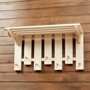 Полка-вешалка для бани, сауны, загородного дома или дачи. Изготовлена из натурального дерева – липы. Липовая древесина долговечна, не темнеет со временем, не гниет, не рассыхается, не выделяет при нагревании вредных веществ. Такие изделия прекрасно выдерживают высокие температуры, не обжигают тело, поэтому активно используются в парных и саунах. Изделие ничем не обработано, имеет натуральный цвет дерева с приятным белым, чуть розоватым оттенком. При желании можно обработать специальными составами: маслом или морилкой. Вешалка имеет 7 крючков для одежды или банных принадлежностей.