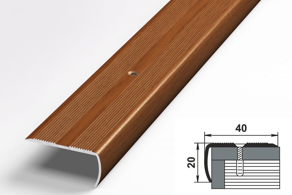 Алюминиевый профиль ПУ-06.Внешний угол (накладка на ступень), 40 х 20 мм. C двумя зонами рифления против скольжения и округленной торцевой стороной. С монтажными отверстиями.