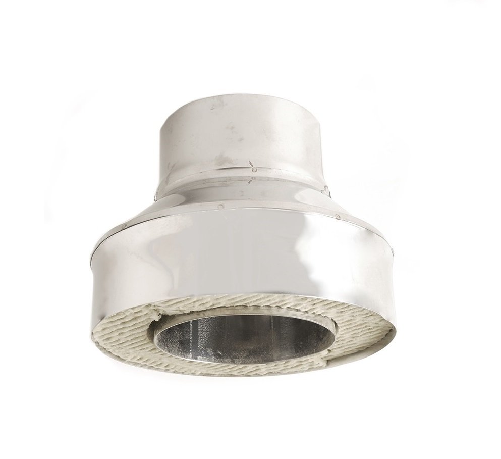 Переходы устанавливается при переходе с неутепленной системы на утепленную (с одноконтурного дымохода на двухконтурный). Элемент дымохода "Переход на сэндвич" изготовлен из нержавеющей стали 0,5 мм.