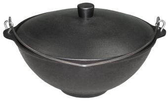 Казан чугунный чаша азиатская объёмом 8 литров с алюминиевой крышкой прекрасно подходит для приготовления блюд на открытом огне или углях. Плоское дно позволяет приготовить плов, как на открытом огне, так и в домашних условиях на электрической или газовой плите.