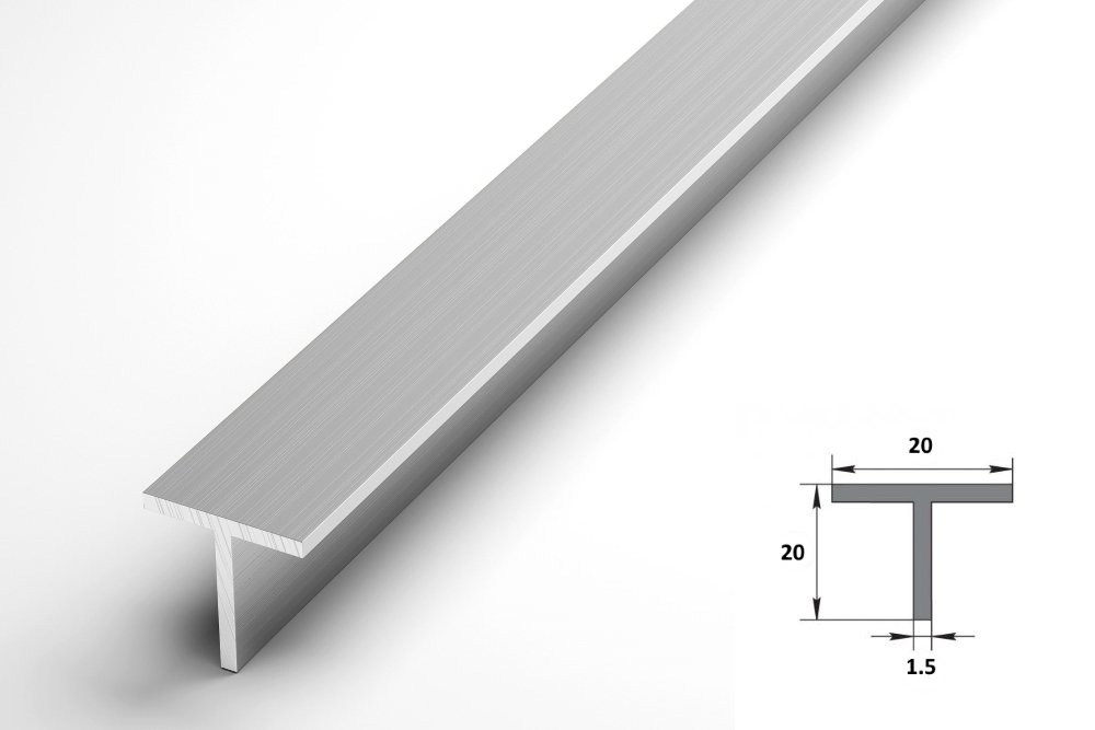 Сплошной профиль с Т-образным сечением. Тавры толщиной в 1,5 мм, со сторонами 20х20 мм, где первая цифра – ширина верхней планки, а вторая – планки под углом 90 градусов к первой. Длина профиля 2 м. Поверхность профиля не декорирована и не защищена. При частых механических нагрузках она быстро затрется.