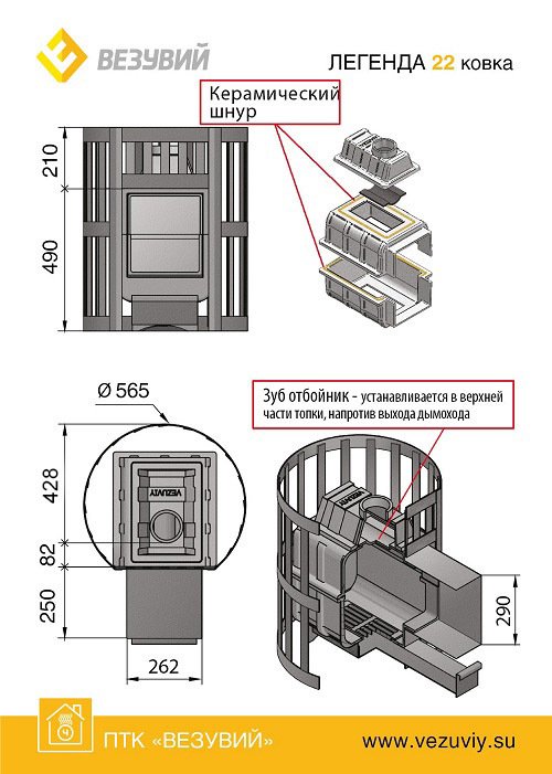 Преимущество печи в том, что топка печи состоит из 3-х элементов. На стыке между ними используется керамический шнур с рабочей температурой 1200 градусов. То есть топка печи абсолютно герметична! Для фиксации деталей между собой применяется болтовое соединение, что даёт 100% гарантию безопасности при эксплуатации.