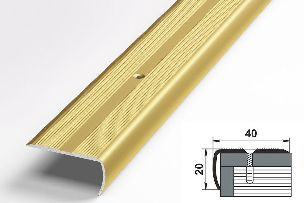Угловой профиль из алюминия служит для защиты углов и ступеней лестницы. Длина 900мм. Размер горизонтальной стороны 40мм. Вертикальной 20мм.