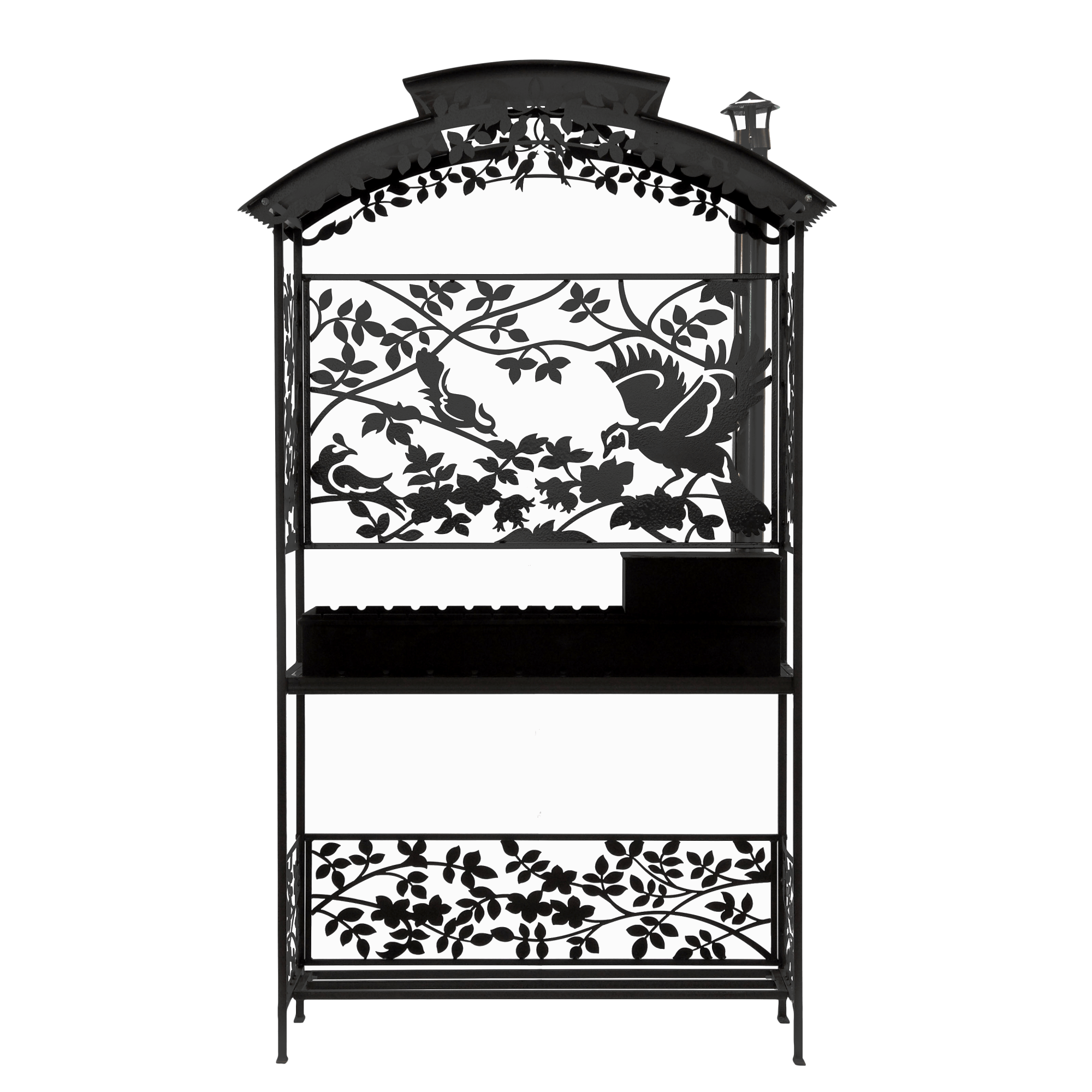 Мангал Птицы Лайт М108К (с печью под казан) - это металлический разборный мангал среднего размера с крышей и резными рисунками в виде птиц в шиповнике.