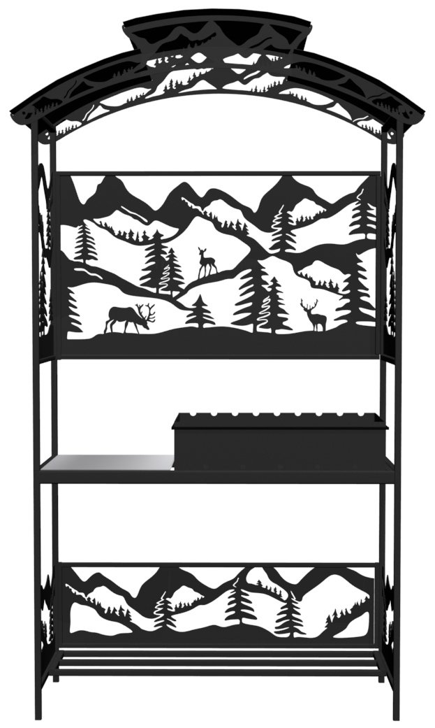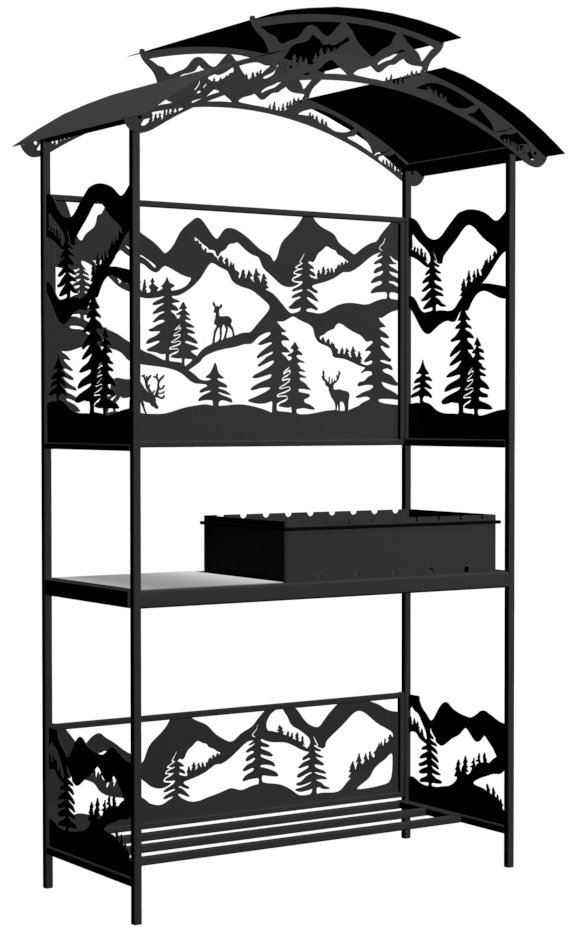 Мангал Олени - это металлический разборный мангал среднего размера с крышей и резными рисунками в виде оленей в лесу.