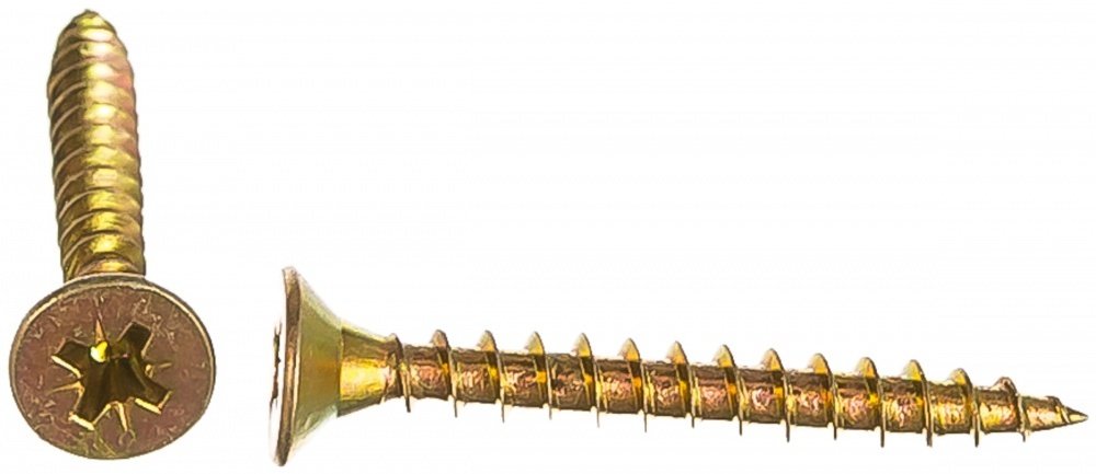 Используется для крепления различных конструкций к дереву, фанере, ДСП. Шуруп имеет потайную головку с крестообразным шлицем (PZ) и острый наконечник.