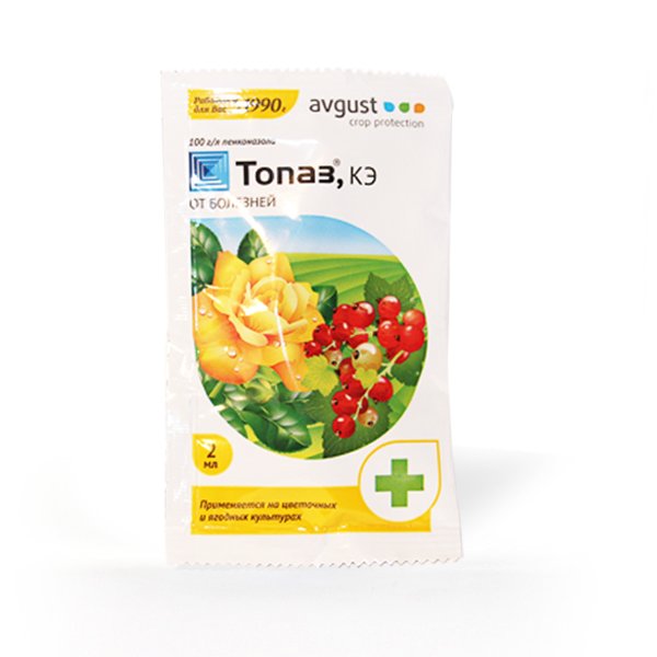 Может использоваться для профилактики и лечения растений (цветочных культур и смородины) от мучнистой росы и ржавчины. Средство отличается высокой скоростью действия – останавливает рост мицелия уже через 2–3 часа после обработки. Оно проникает внутрь растений, за счет чего защищает не только листву и стебли, но и молодые побеги даже в неблагоприятных погодных условиях. Препарат «Топаз» обеспечивает длительный эффект на протяжении не менее 10–14 дней.