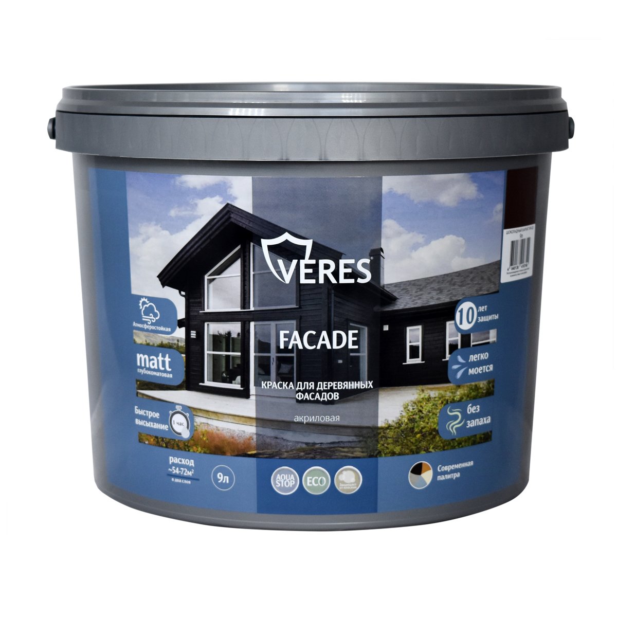 Краска для деревянных фасадов Veres Facade, акриловая, идеальна для зданий - памятников архитектуры. Обладает превосходной адгезией (сцеплением) к штукатурке, шпатлевке, бетону, кирпичу, гипсоволокно, гипсокартону, фанере, дереву, ДСП, ДВП, МДФ, загрунтованному металлу. Выдерживает влажную уборку с применением неабразивных моющих средств. Содержит антисептик.