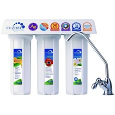 Экономичный трехступенчатый фильтр Гейзер-3 для жесткой воды представляет собой небольшое устройство со стандартной схемой фильтрации воды с увеличенным ресурсом по удалению тяжелых металлов, железа, хлора и органических примесей. Имеет достаточно небольшой, компактный размер. Поставляется в комплекте с краном №3.