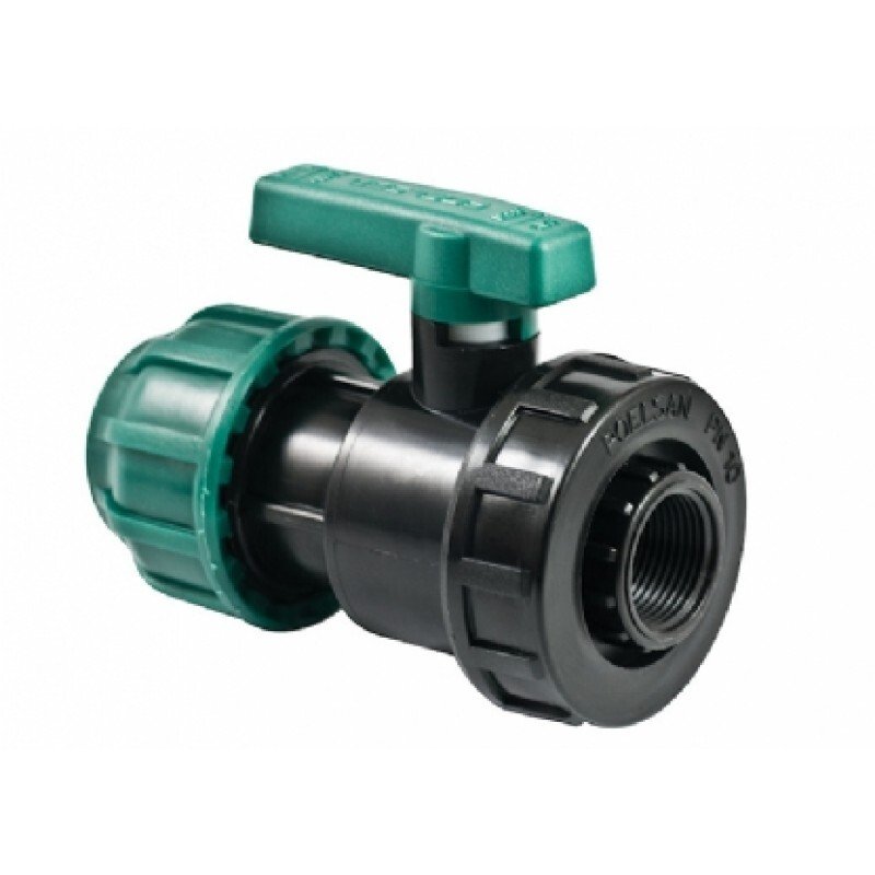 Шаровый кран компрессионный имеет с одной стороны внутреннюю резьбу, равную стандартному размеру стальных резьб, а с другой стороны цанговый зажим, что позволяет использовать шаровый кран компрессионный как переходной элемент трубопровода с возможностью регулирования потока воды. Данный кран может использоваться совместно с другими фитингами как пластиковыми, так и из других материалов.