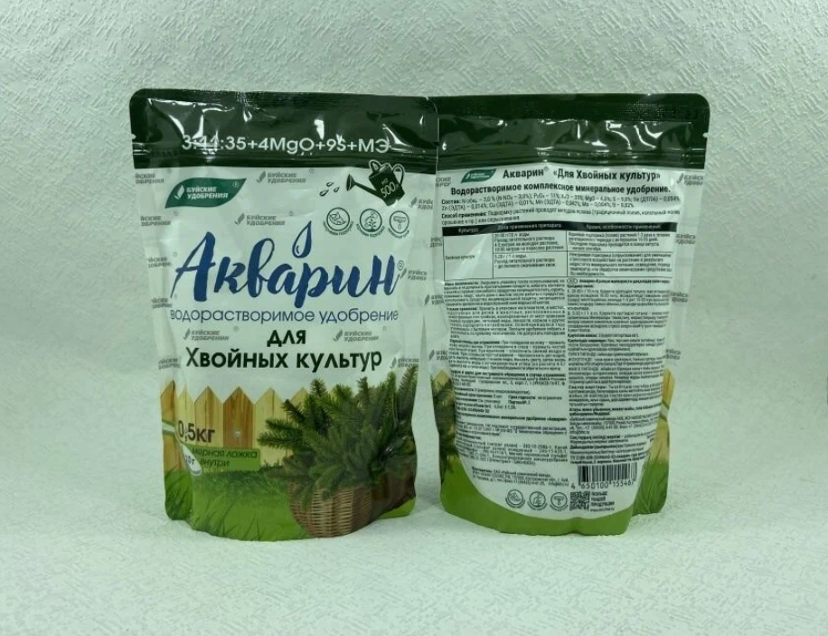 Акварин для хвойных культур - водорастворимое удобрение, в состав которого входит азот, фосфор, калий, магний, сера и микроэлементы – железо, цинк, марганец, медь в хелатной форме, а бор и молибден – в минеральной. Благодаря кислой реакции (рН) удобрения, оно легко растворяется в холодной воде и более эффективно усваивается корневой системой или листовой поверхностью растений.